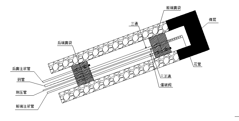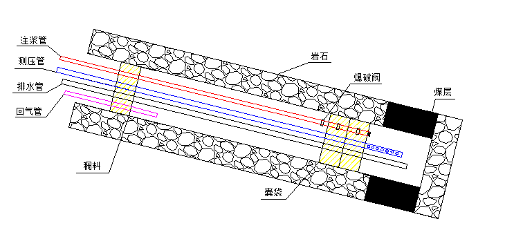 4、帶壓注漿。連接注漿泵及注漿管路,并用清水實驗泵及管路是否正常,確認正常后將封孔劑與水按照質(zhì)量比1:1比例混合均勻,啟動注漿泵向孔內(nèi)注漿。漿液率先注入孔底兩個囊袋內(nèi),待囊袋充起并濾水凝固后,注漿壓力達到0.6MPa左右,此時爆破閥爆破,漿液自行注入鉆孔中間密封腔,待漿液從回漿管持續(xù)返出時,關(guān)閉回漿管閥門,并繼續(xù)向孔內(nèi)加壓注漿,直至注漿壓力達到1.5-2MPa時,停止注漿;